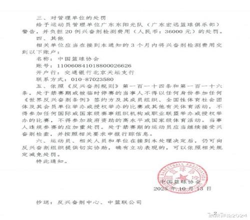 在国家体育总局反兴奋剂中心于2025年4月16日实施的赛内兴奋剂检查中,你单位男子篮球运动员吉伦沃特的A样本尿样检测结果呈大麻酚类(羧基四氢大麻酚)阳性。
