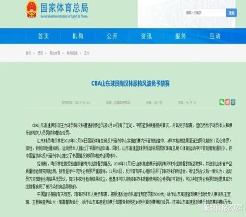 CBA山东高速俱乐部主力球员遭遇的尿检风波1月10日有了定论,中国篮协根据相关事实,对其免予禁赛,但仍然给予球员本人和俱乐部相关人员罚款和警告处罚。