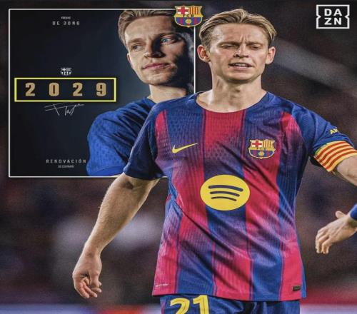 “德容将长期身披巴萨战袍。今天,这位中场球员与巴塞罗那足球俱乐部签署了新合同,合同有效期至2029年。德容与俱乐部主席拉波尔塔共同出席了在俱乐部总部举行的签约仪式。”