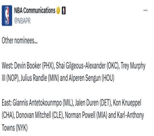 西部:布克(太阳)、亚历山大(雷霆)、墨菲(鹈鹕)、兰德尔(森林狼)、申京(火箭)