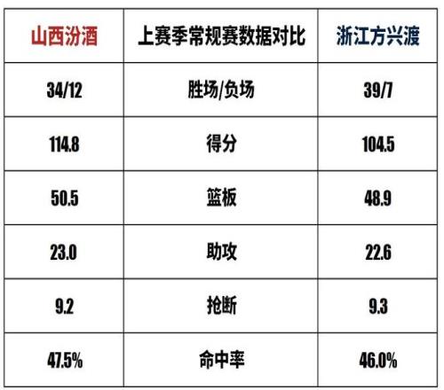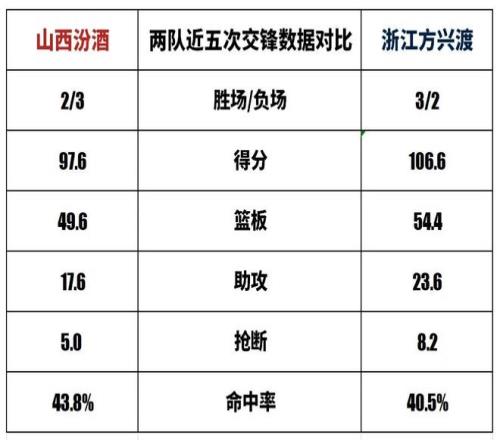 山西汾酒与浙江方兴渡历史上一共交手51次,山西汾酒18胜33负。上赛季常规赛两队交手4次,山西汾酒2胜2负。